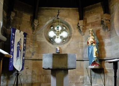 The church contains many interesting features, including box pew ends (converted to wall panelling in 1884), the 1803 colours (flag) of the Ashton-upon-Mersey and Sale Volunteers. Unusually, the church has three fonts! The timbers for the double hammer beam roof are thought to have come from an earlier church, the main oak door of which is still in use today. There are several stained glass windows, some in memory of local people. The Jardine organ dates from 1857, replacing an earlier instrument.